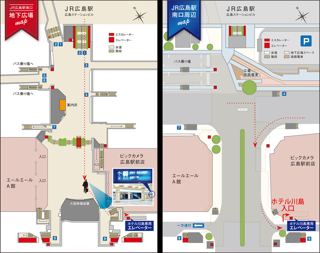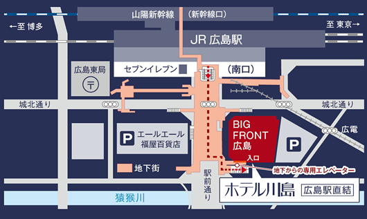 1.広島駅南口在来線改札口から出られて、エールエール地下イベント広場方面へお越し下さい。